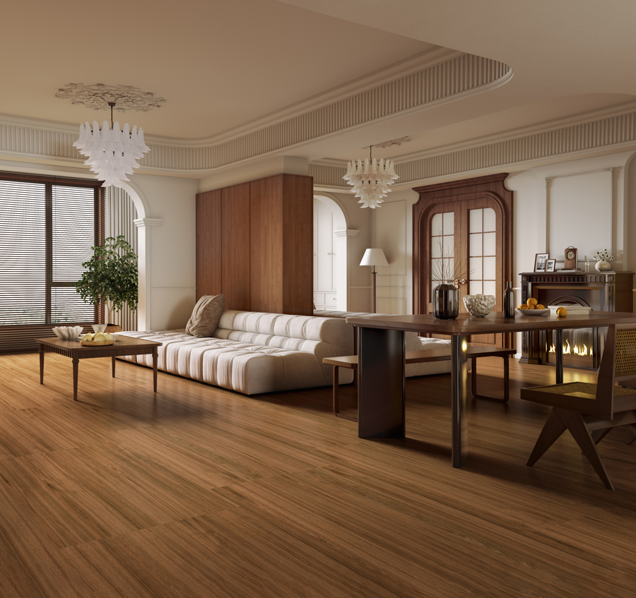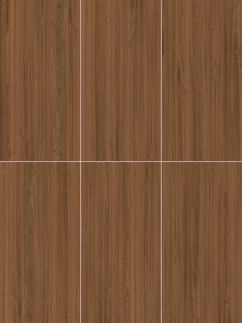Con un brillo mate ultrasuave de 6°, las baldosas evocan una profunda sensación de tranquilidad y sofisticación. Los tonos marrones, que varían naturalmente, transmiten profundidad y sobriedad, evocando la estabilidad duradera de la tierra. Las líneas entrelazadas de vetas de madera fluyen dinámicamente por la superficie, como notas musicales en una partitura, fusionando ritmo y refinamiento.