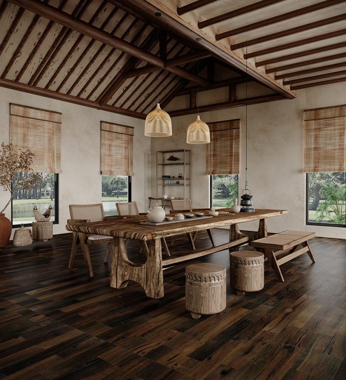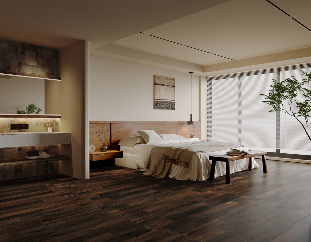 Los ricos tonos de marrón cálido y gris oscuro de estilo vintage se ven realzados por sutiles gradaciones de luz y sombra, junto con delicados matices rojizos propios del paso del tiempo. Las profundas grietas y nudos añaden un marcado contraste, realzando el carácter distintivo de la colección.