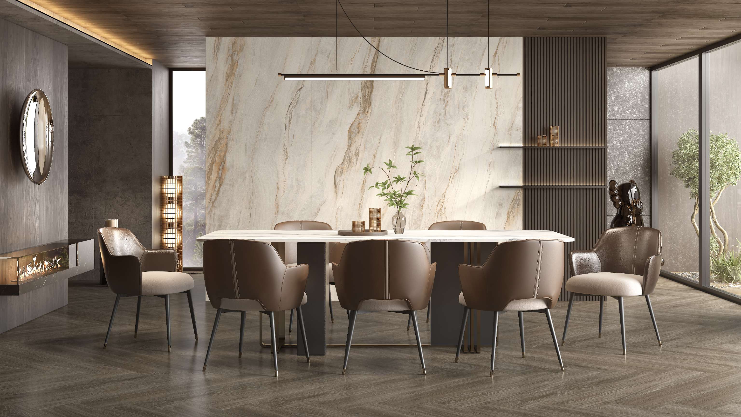 Los azulejos de porcelana con efecto mármol exhiben una intrincada red de vetas de piedra natural, infinitamente variadas y visualmente atractivas. Su superficie es suave y sedosa al tacto, con sutiles variaciones de textura. Sus lujosos y majestuosos diseños los hacen ideales para espacios abiertos, creando una atmósfera moderna y de una elegancia discreta.
