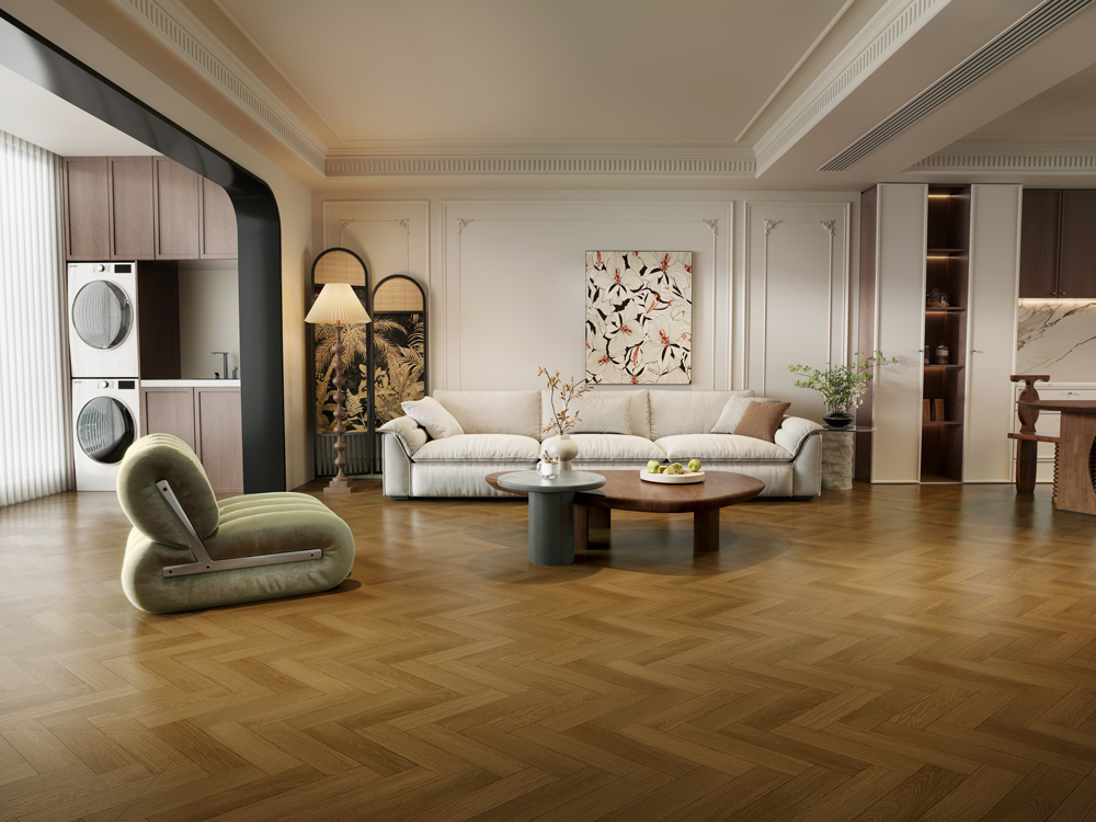 Inspirada en el roble del milenario Castillo de Windsor, esta colección de azulejos Windsor Oak presenta un clásico patrón de espiga con una textura fina y natural. Gracias a su acabado micromoldeado, la experiencia visual y táctil reproduce fielmente la veta de la madera auténtica.